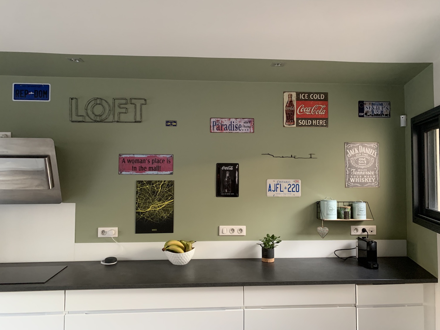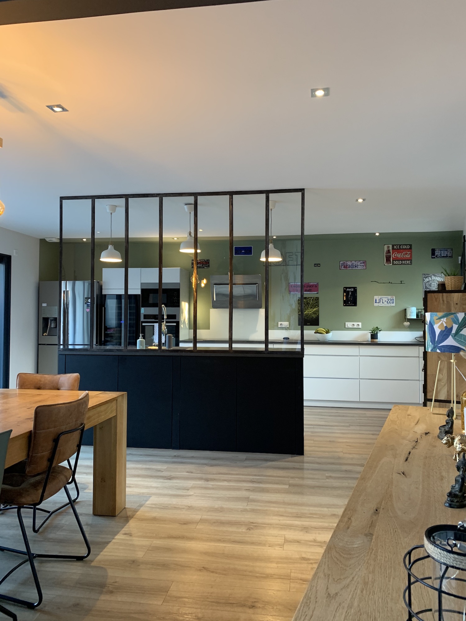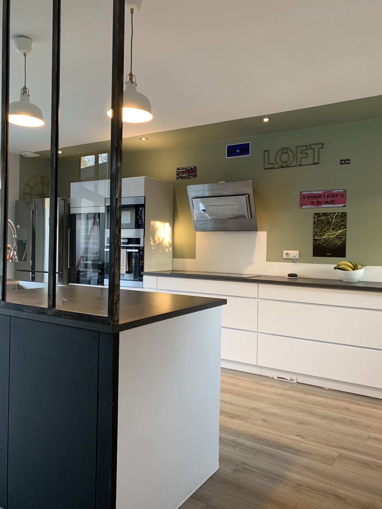 Adoptez le charme d’une cuisine moderne avec ce vert kaki associé aux meubles blancs. La couleur du mur qui revient sur le plafond donne un effet de profondeur et met en valeur cette vaste cuisine ouverte avec son îlot et sa verrière.